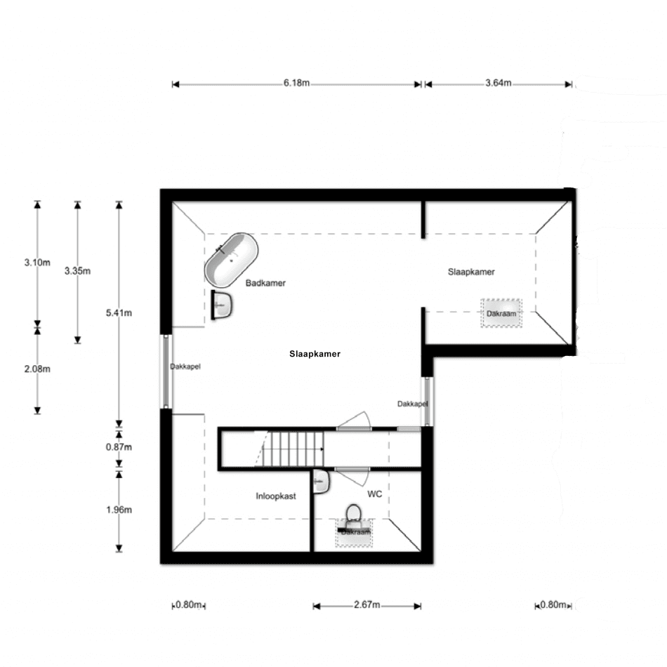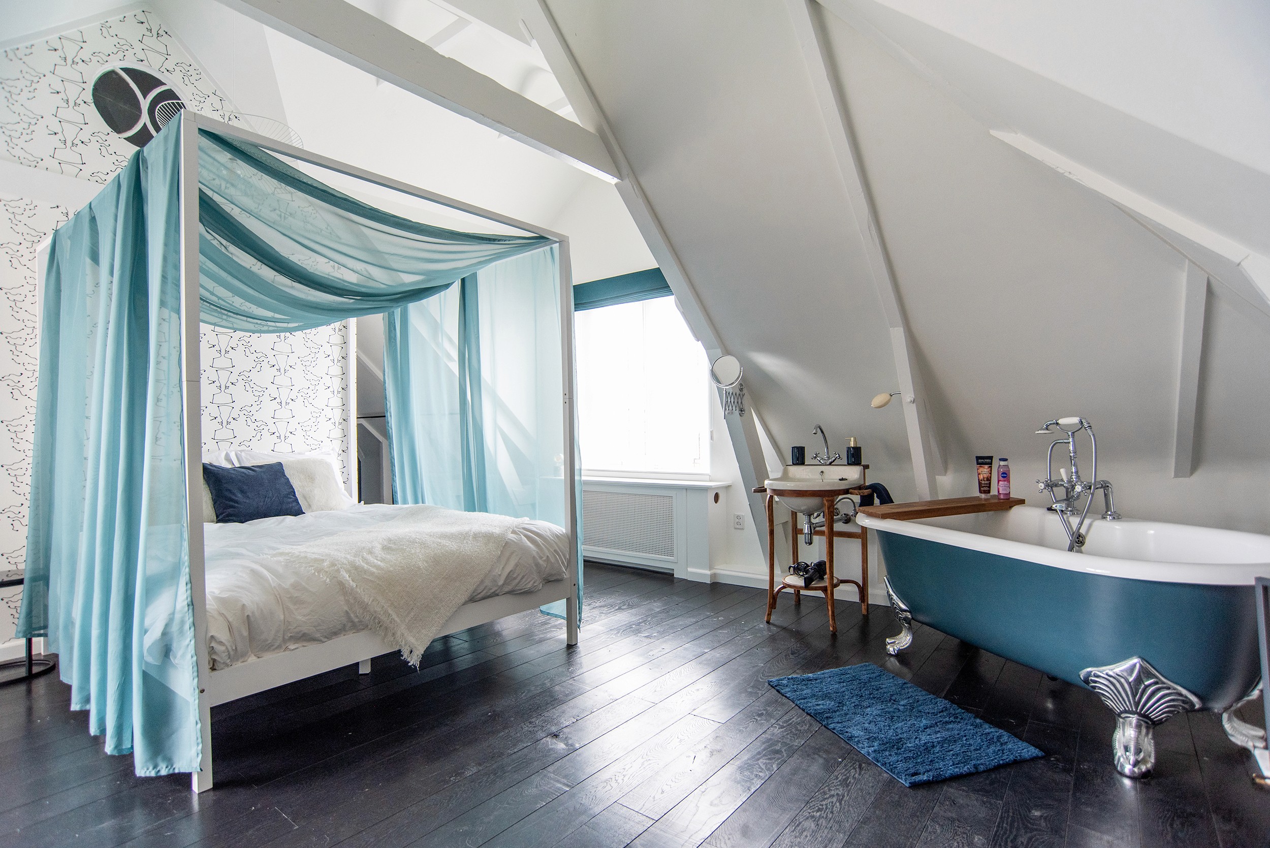 Via een open trap kom je op de eerste verdieping. Hier is een afzonderlijk toilet en een ruime slaapkamer met tweepersoonsbed en klassiek bad. Hier is ook een inloopkast om alle kleding eenvoudig (uit het zicht) op te bergen/hangen.