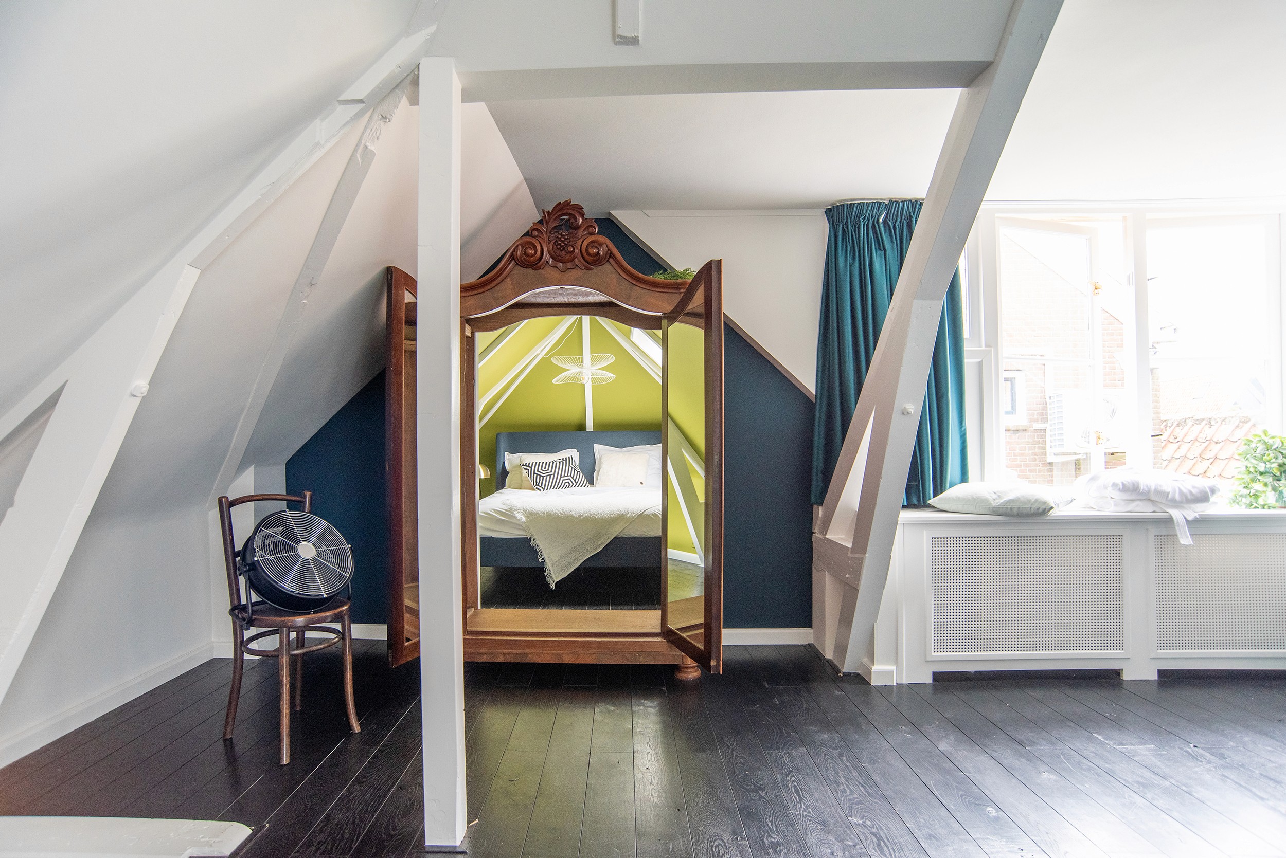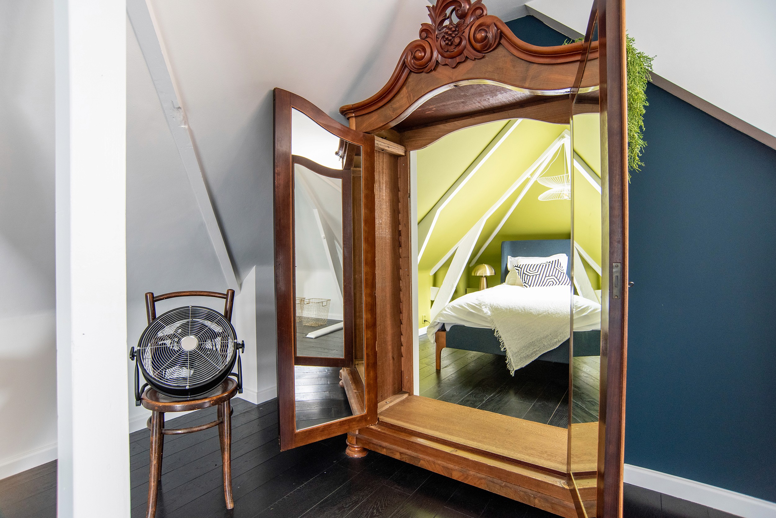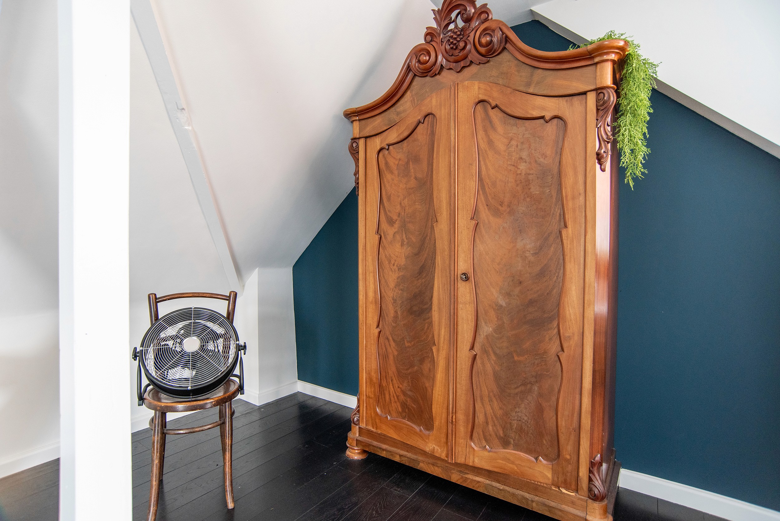 Op de slaapkamer staat ook een antieke kledingkast. Maar niets is wat het lijkt: sla de deuren van deze kast open en daar wacht een verrassing: nog een slaapkamer met een tweepersoonsbed.