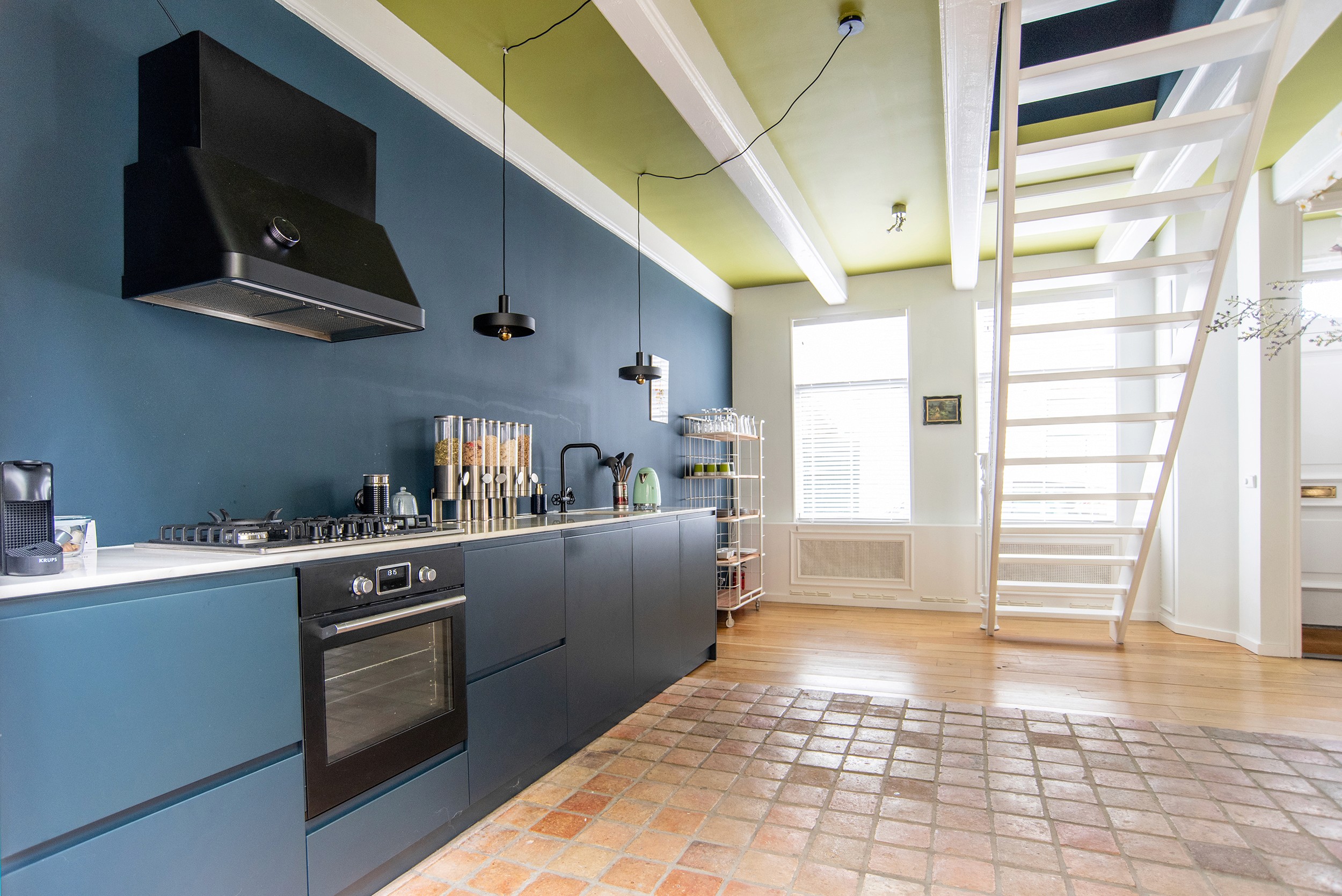 Bij binnenkomst vallen direct de historische details op: de oud-Amsterdamse kastdeuren, de open haard en de ingebouwde boekenkast. De begane grond is een open ruimte met zitgedeelte aan de open haard, eettafel en een nieuw ingebouwde keuken (o.a. voorzien van vaatwasser, oven, koelkast). Vanuit de keuken kan je de deuren openslaan naar de privé afgesloten patio, bedekt door een Blauwe regen (Wisteria).